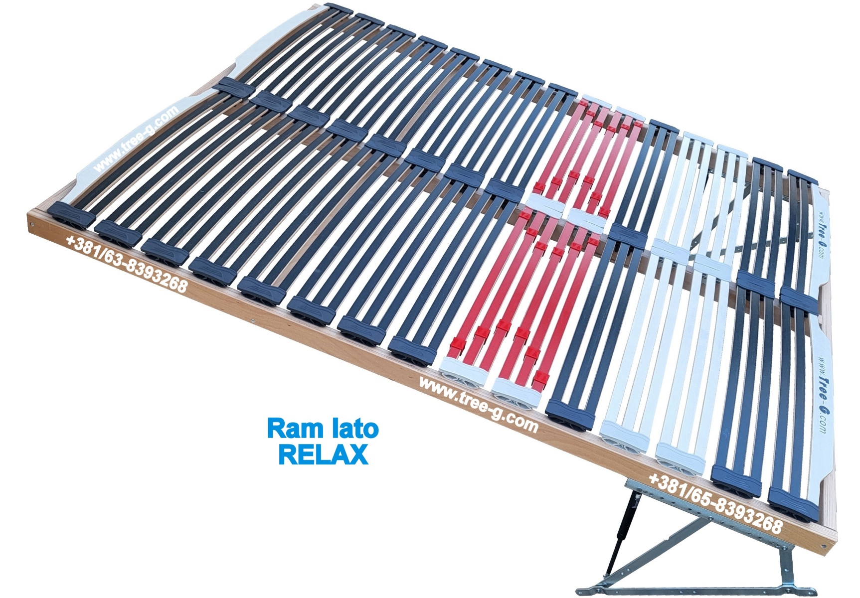 Podloga sa ojačanim ramom RELAX-RELAKS ima 39 do 45 latofleks letvica u gornjoj zoni plus 6 letvica u donjoj zoni koje služe za regulaciju tvrdoće u lumbalnom delu.